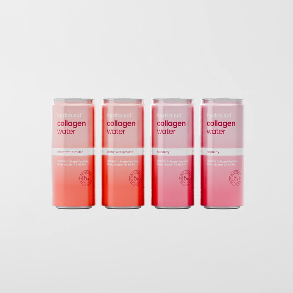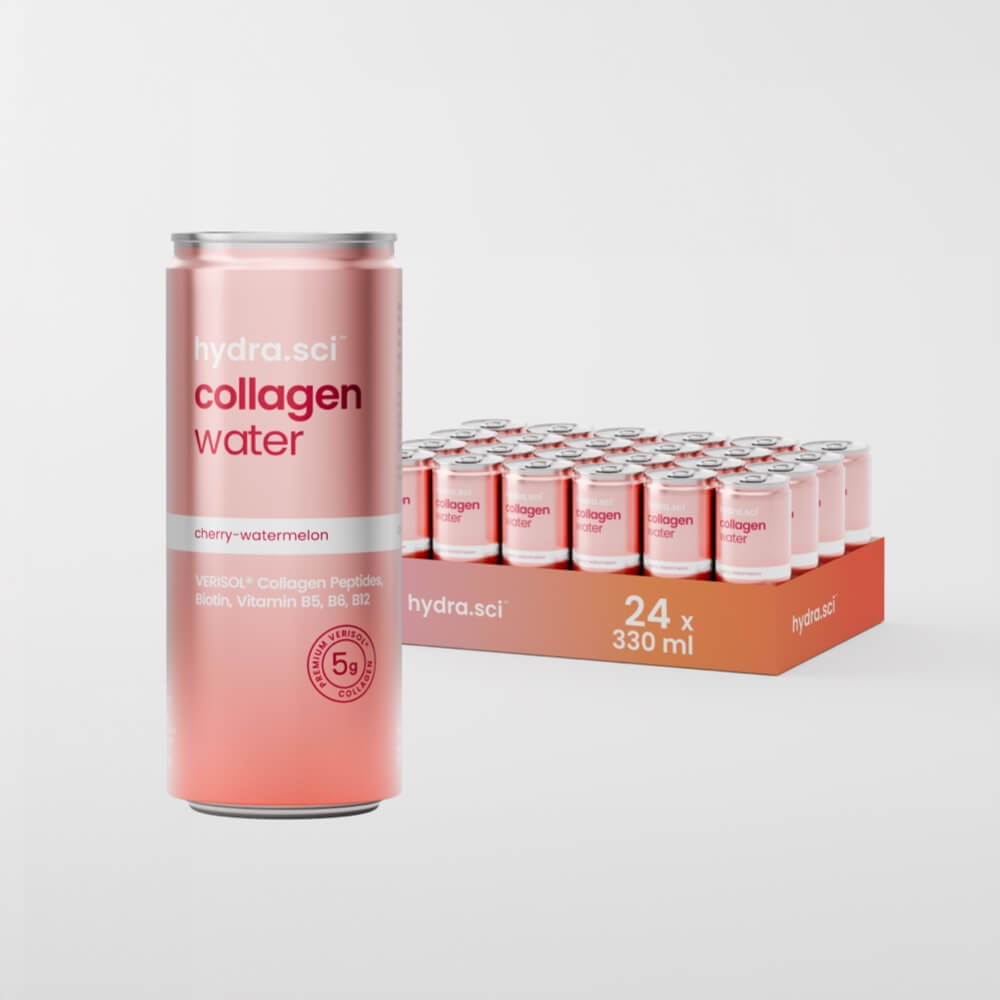 Kullsyreholdig vann, kollagenhydrolysat, surhetsregulerende middel (sitronsyre, trinatriumsitrat), naturlig aroma (kirsebær-vannmelon), søtningsmiddel (sukralose, acesulfam), vitamin B5 (pantotensyre), vitamin B6, biotin, vitamin B12.